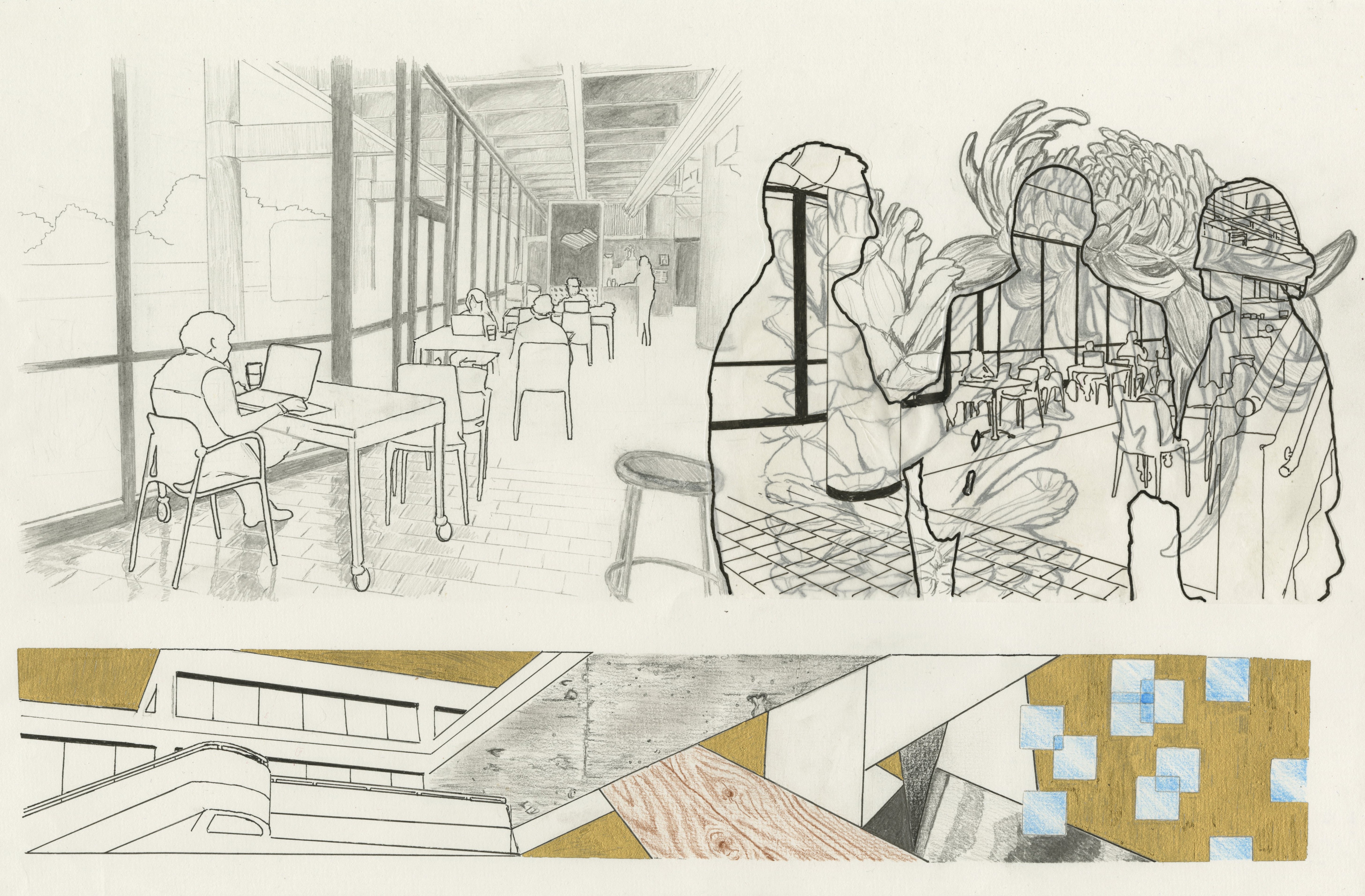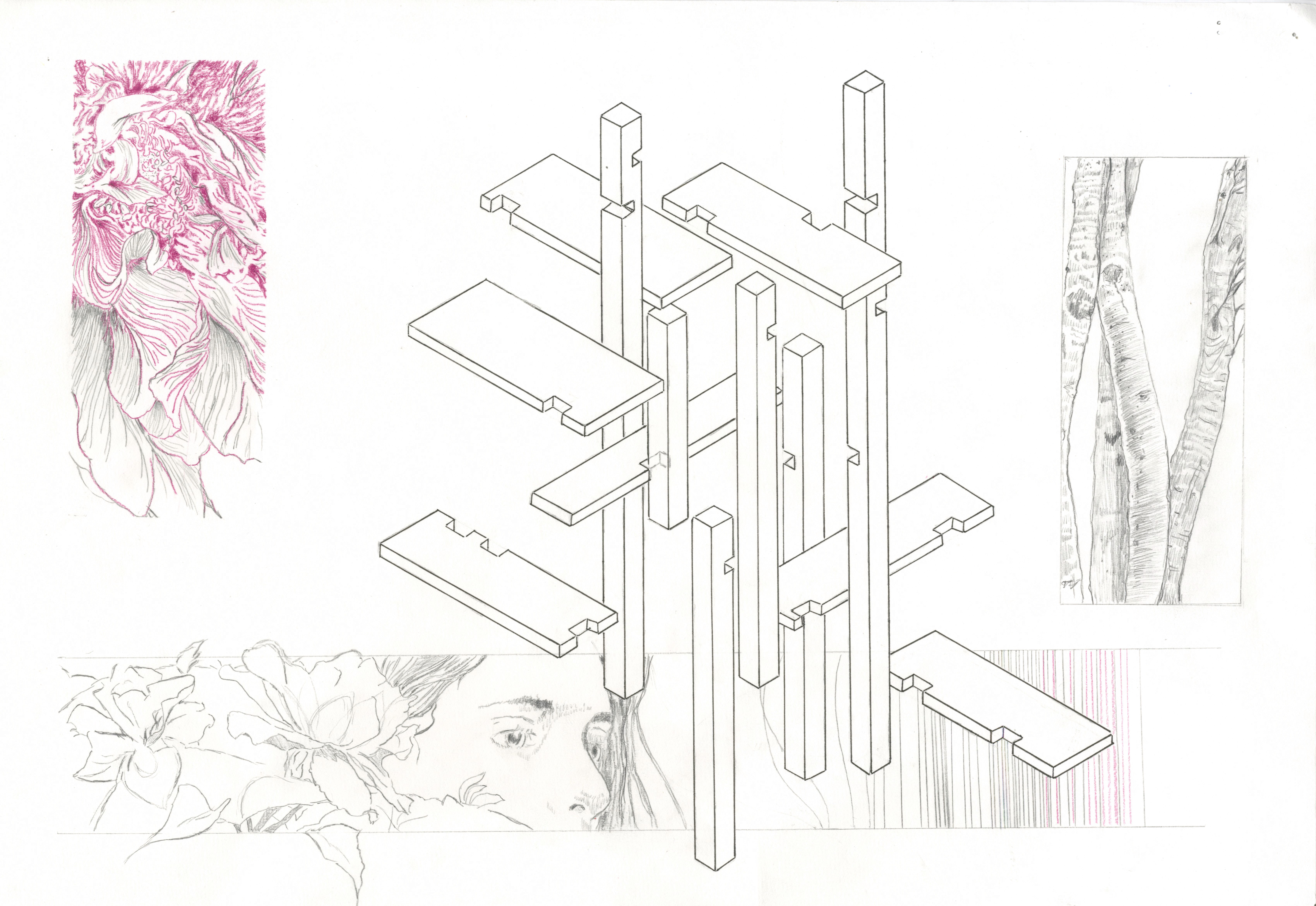 Sketches drift across the page like quick conversations with the studio itself—loose lines echoing drafting tables, pinned critiques, and the constant shuffle of paper. They capture the immediacy of the design school’s material world, where ideas are always in motion and nothing stays precious for long.