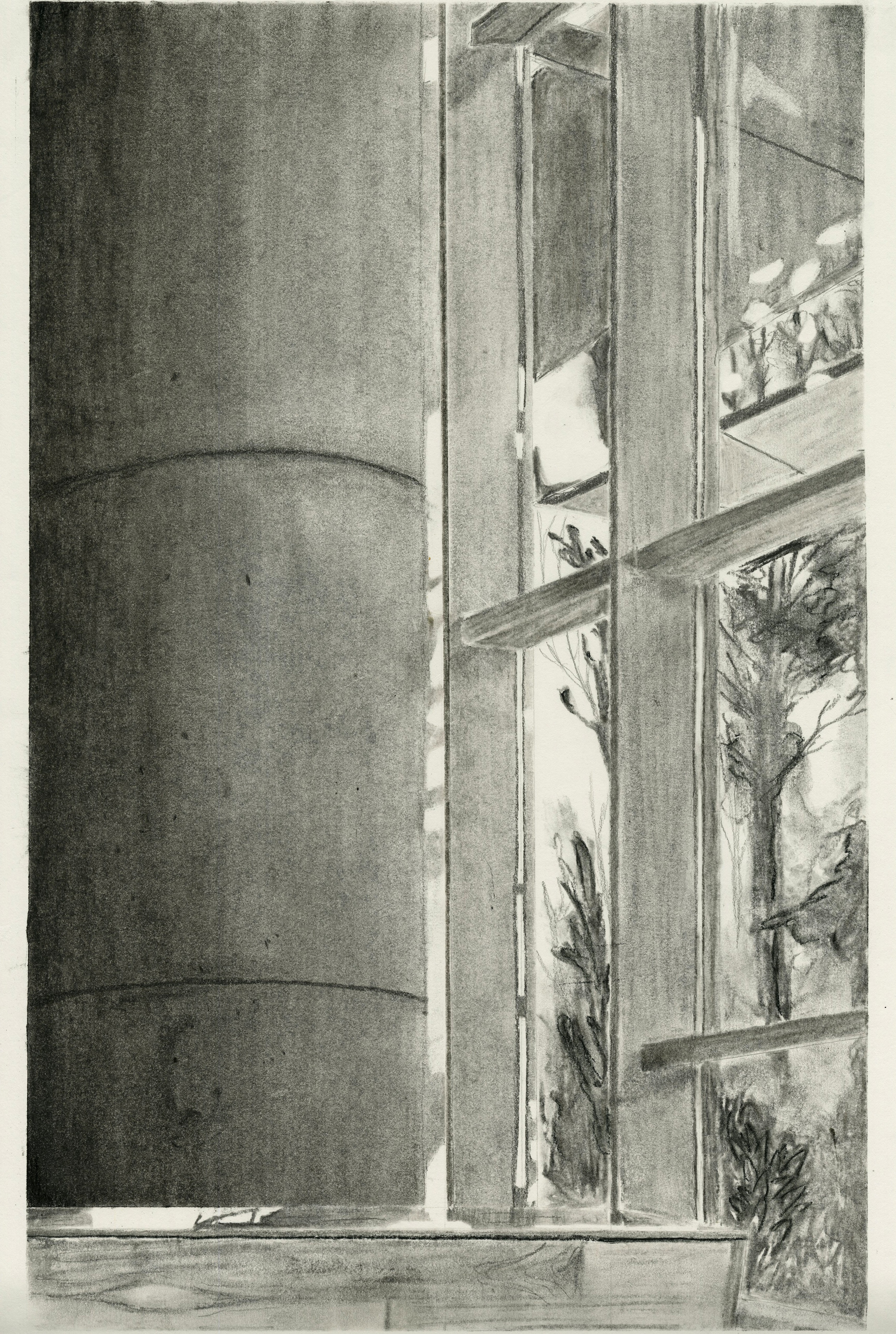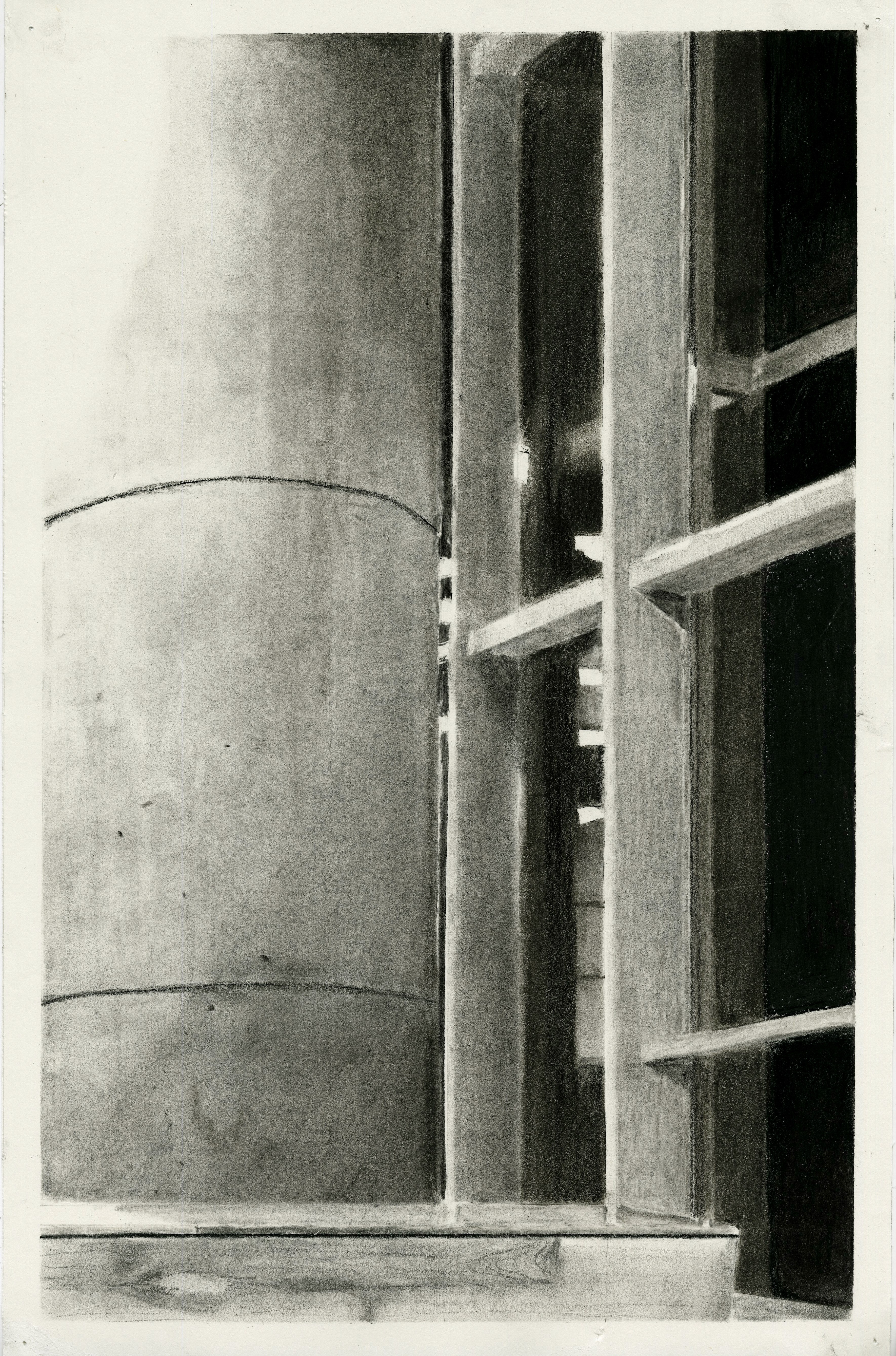 Charcoal drawings ground that same environment in weight and texture, pressing shadows into the grain of the paper like worn concrete floors and smudged workbenches. The soft black dust mirrors the residue of making—evidence of a space where materials are handled, tested, and transformed every day.